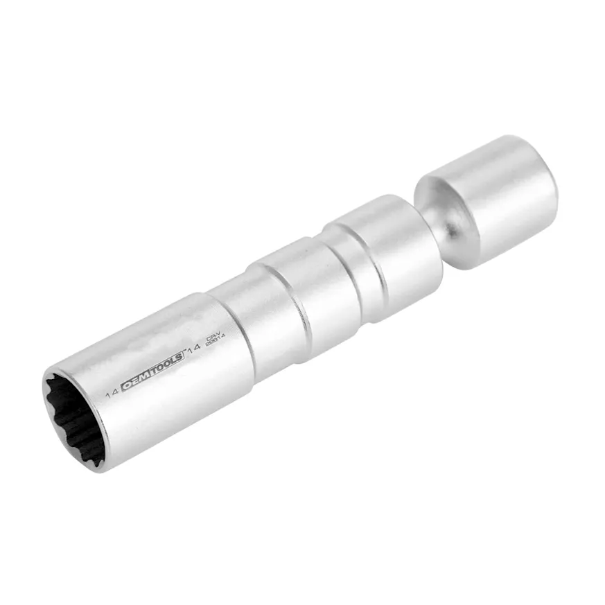 The OEMTOOLS 22814 3/8 Inch Drive 14 mm x 12 Pt. Spark Plug Socket is designed with a universal joint to reach spark plugs situated in tight spaces.
